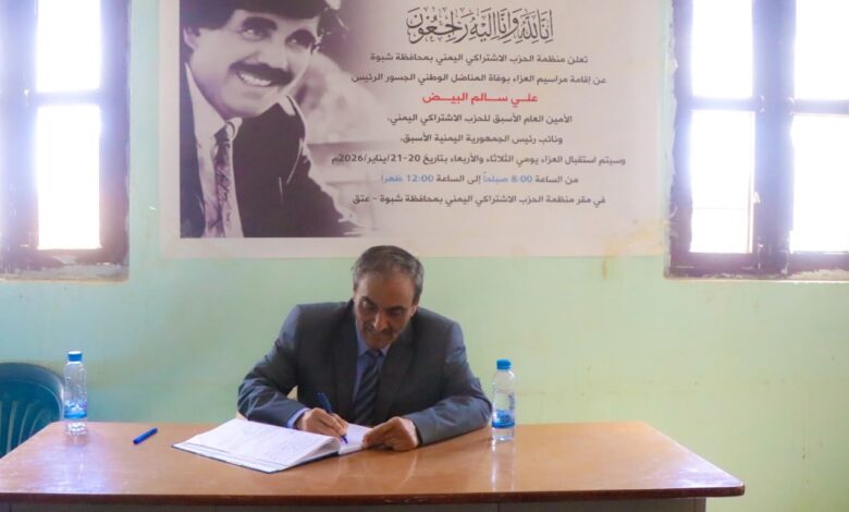 السلطة المحلية بشبوة تقدم التعازي في وفاة المناضل الرئيس علي سالم البيض.