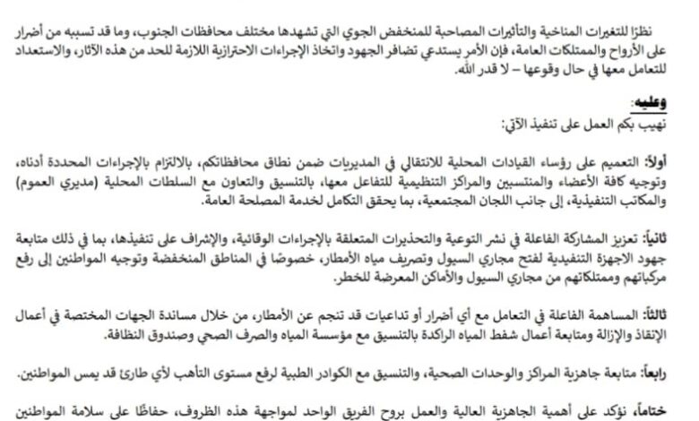 الانتقالي يوجّه قياداته المحلية برفع الجاهزية لمواجهة تأثيرات المنخفض الجوي ” وثيقة “