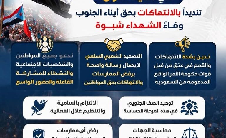 انتقالي شبوة يدعو أبناء المحافظة للاحتشاد الجماهيري في كافة المديريات تضامناً مع أبناء حضرموت ووفاءً لشهداء المحافظة