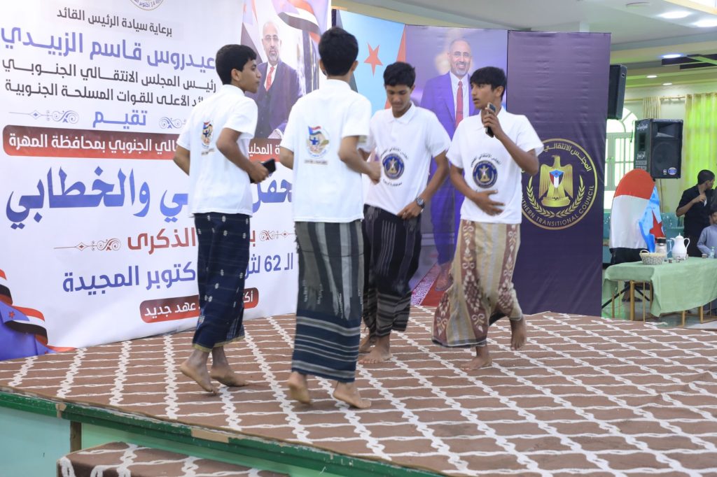 وتخلل الحفل فقرات فنية وثقافية متنوعة، شملت الإنشاد الوطني، والقصائد الشعرية، والرقصات التراثية المهرية التي عبّرت عن حب الوطن وتمسك أبناء المهرة بهويتهم الجنوبية، وسط تفاعل كبير من الحضور الذين امتلأت بهم قاعة الفعالية.