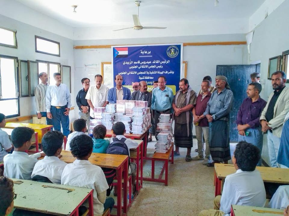 دشنت إدارة التعليم بالهيئة التنفيذية للقيادة المحلية للمجلس الانتقالي الجنوبي، في محافظة شبوة، اليوم الخميس، عملية توزيع الكتاب المدرسي لعددٍ من مدارس مديريات المحافظة، بحضور فريق التوجيه والرقابة الرئاسية، برئاسة عضو هيئة رئاسة المجلس، الدكتور سالم القميري.