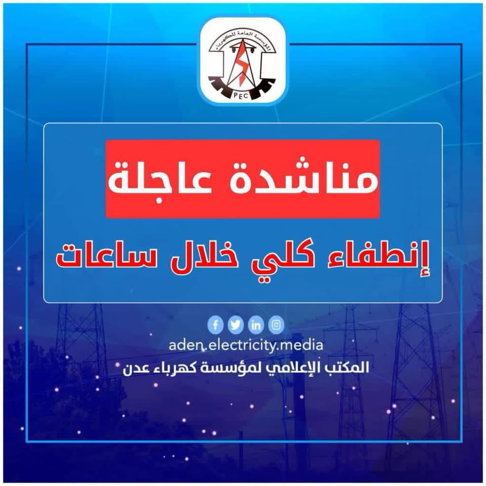 ناشدت المؤسسة العامة لكهرباء عدن مجلس القيادة الرئاسي ورئاسة الحكومة بالتدخل العاجل لتوفير وقود محطات الكهرباء، وذلك لتفادي التوقف الكلي لمحطات التوليد ودخول العاصمة عدن في ظلام دامس.