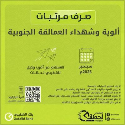 وأوضحت مصادر مطلعة أن اختيار بنك القطيبي يأتي ضمن إجراءات تنظيمية تهدف إلى تسهيل عملية الصرف وضمان وصول المستحقات إلى أصحابها بدقة وشفافية، استنادًا إلى قاعدة بيانات محدثة ومتكاملة.