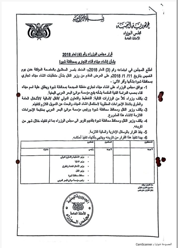 وأوضح الأهالي أن ميناء قنأ التجاري في محافظة شبوة ليس منفذاً مستحدثاً، ولا مشروعاً خارج الأطر القانونية للدولة، بل هو صرح اقتصادي وطني أُنشئ بقرار رسمي صادر عن مجلس الوزراء رقم (4) لعام 2018م، الذي نص صراحة على الموافقة على إنشاء الميناء التجاري بمنطقة المجدحة بمديرية رضوم تحت اسم ميناء قنا، وجعل تبعيته لمؤسسة موانئ البحر العربي، مع تكليف الوزارات المعنية ومحافظ المحافظة باستكمال الإجراءات التنفيذية والتمويلية اللازمة.