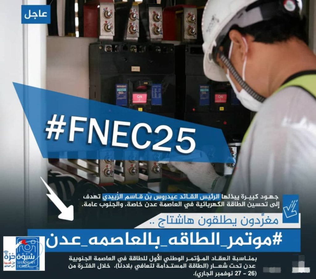 أطلق سياسيون ونشطاء عصر اليوم الأربعاء 26 نوفمبر / تشرين الثاني 2025م، وسم #موتمر_الطاقه_بالعاصمه_عدن ، وكذا وسم #FNEC25 على منصات التواصل الاجتماعي