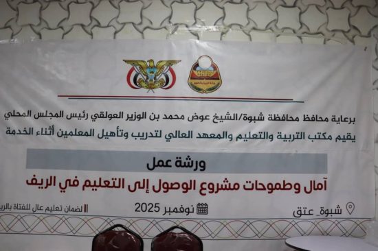 برعاية محافظ محافظة شبوة، عوض محمد بن الوزير، دشّن الأمين العام للمجلس المحلي بالمحافظة، عبدربه هشلة ناصر، صباح اليوم الأربعاء، ورشة العمل التربوية التي أقيمت تحت عنوان “آمال وطموحات مشروع الوصول إلى التعليم في الريف”، والتي نظمها مكتب التربية والتعليم بالمحافظة بالتنسيق مع المعهد العالي للمعلمين والمعلمات، وذلك في إطار الجهود الرامية إلى تعزيز التعليم في المناطق الريفية وتحقيق مبدأ تكافؤ الفرص التعليمية.
