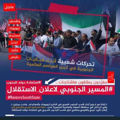 وتزامنت هذه الحملات مع استعداد أبناء شعب الجنوب العربي في الخارج للخروج في مسيرات سلمية حاشدة، يوم غدٍ السبت، في كل من مدينة نيويورك الأمريكية، والعاصمة الهولندية أمستردام، والعاصمة البريطانية لندن، والعاصمة الألمانية برلين، حيث سيحتشد الجنوبيون أمام مقرات دولية، وفي مقدمتها مقر الأمم المتحدة، للتعبير عن مطالبهم السياسية المشروعة.