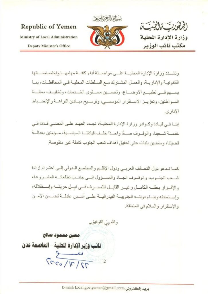 وصدر البيان مذيّلًا بتوقيع نائب وزير الإدارة المحلية معين محمود صالح، بتاريخ الاثنين 22 ديسمبر 2025، من العاصمة عدن.
