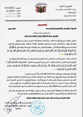 وجه مدير عام مكتب الأوقاف والإرشاد بمحافظة شبوة، الشيخ محسن محمد حسين، تعميماً لكافة أئمة وخطباء المساجد بالمحافظة، دعا فيه إلى ضرورة الاصطفاف خلف ولاة الأمر والالتزام بالسمع والطاعة حفاظاً على الأمن والاستقرار في المحافظة.
