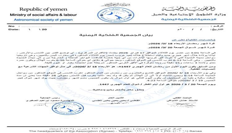 أعلنت الجمعية الفلكية اليمنية، مساء الاثنين، عن بيانها الرسمي المتضمن حسابات فلكية مفصلة لتحديد مواقيت بداية شهر رمضان المبارك وعيد الفطر السعيد للعام الهجري 1447.