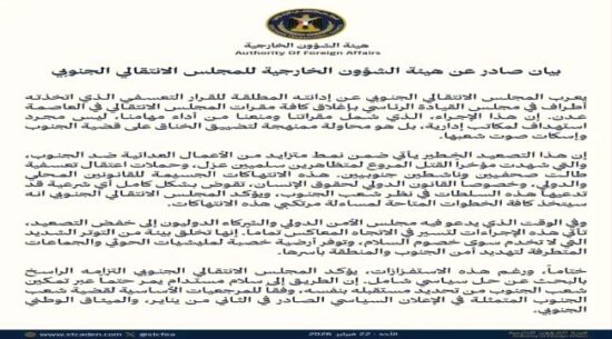 وأكدت هيئة المجلس الانتقالي في بيان” أن هذا الإجراء لا يندرج ضمن إطار إداري، بل يأتي في سياق نمط متزايد من الأعمال العدائية التي طالت المتظاهرين السلميين، إلى جانب حملات الاعتقال التعسفية التي استهدفت صحفيين وناشطين جنوبيين، في انتهاك صارخ للقوانين المحلية والدولية، وخاصة ما يتعلق بحقوق الإنسان.