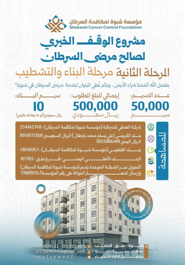 وتحت شعار “بفضل الله أتممنا شراء الأرض.. وبكم تعلي البنيان لخدمة مرضى السرطان في شبوة” أطلقت المؤسسة نداءً إنسانياً واسع النطاق دعت فيه كافة رجال المال والأعمال والخيرين والمؤسسات والجهات ذات العلاقة إلى التكاتف والالتفاف حول هذا المشروع النوعي، معتبرة أن إعلاء بنيان هذا الوقف هو استثمار حقيقي في التراحم الإنساني وتجسيداً لقيم التكافل التي تميز أبناء المحافظة، بما يسهم في رفع المعاناة عن كاهل المرضى وذويهم في ظل الظروف الراهنة.