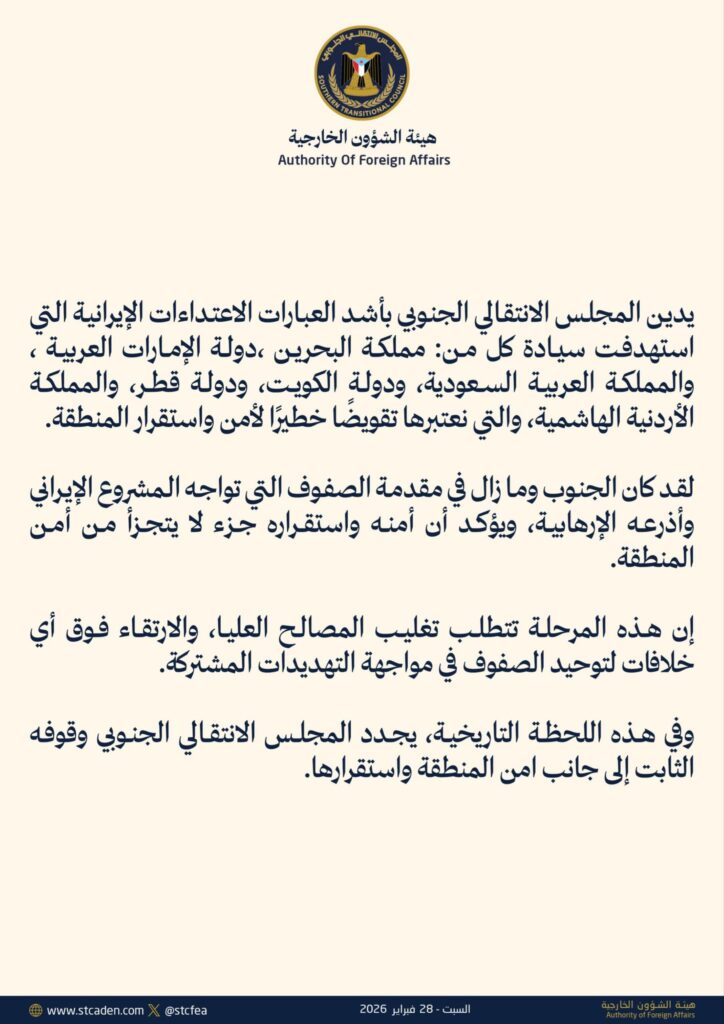 أعرب المجلس الانتقالي الجنوبي، باسم الشعب العربي الجنوبي، عن إدانته واستنكاره الشديدين للهجمات الإيرانية السافرة التي استهدفت عددًا من الدول العربية الشقيقة، وفي مقدمتها المملكة العربية السعودية ودولة الإمارات العربية المتحدة ودولة الكويت ودولة قطر ومملكة البحرين والمملكة الأردنية الهاشمية والجمهورية العربية السورية، مؤكدًا رفضه القاطع لكل أشكال الاعتداء التي تمس أمن واستقرار الدول العربية.