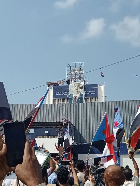 أعاد المواطنون صباح اليوم الأربعاء، رفع صورة رئيس المجلس الانتقالي الجنوبي، الرئيس عيدروس الزُبيدي، فوق مقر الجمعية العمومية للمجلس بالتواهي في العاصمة عدن