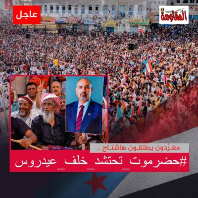 أطلق مغردون جنوبيون هاشتاغ “حضرموت تحتشد خلف عيدروس”، تزامناً مع دعوة المجلس الانتقالي لتنظيم مسيرة سلمية في 4 أبريل 2026، تعبيراً عن التمسك بخيار استعادة الدولة ورفض الوصاية. وحددت المسيرة نقطة التجمع أمام جسر الشهيدين، متجهةً إلى ساحة الحرية بمدينة المكلا، وشددت على الاستمرار خلف قيادة الزُبيدي