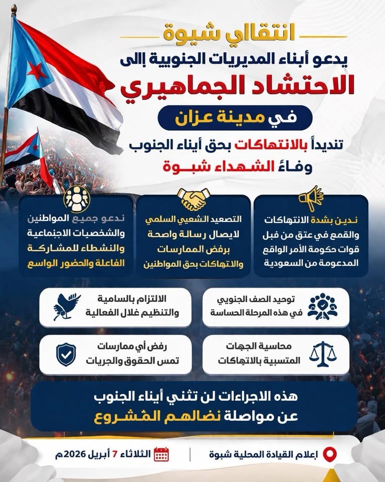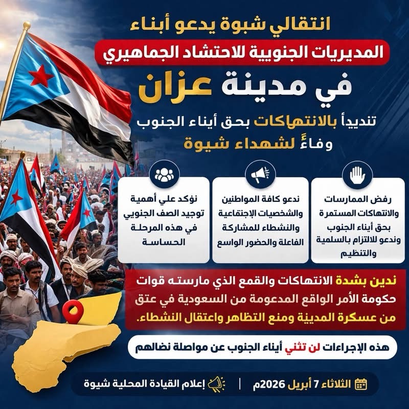 وأكدت قيادة انتقالي شبوة في بيان صادر عنها أن هذه الدعوة تأتي في إطار التصعيد الشعبي السلمي، لإيصال رسالة واضحة برفض الممارسات والانتهاكات المستمرة بحق المواطنين، مشددة على أهمية توحيد الصف الجنوبي في هذه المرحلة الحساسة.