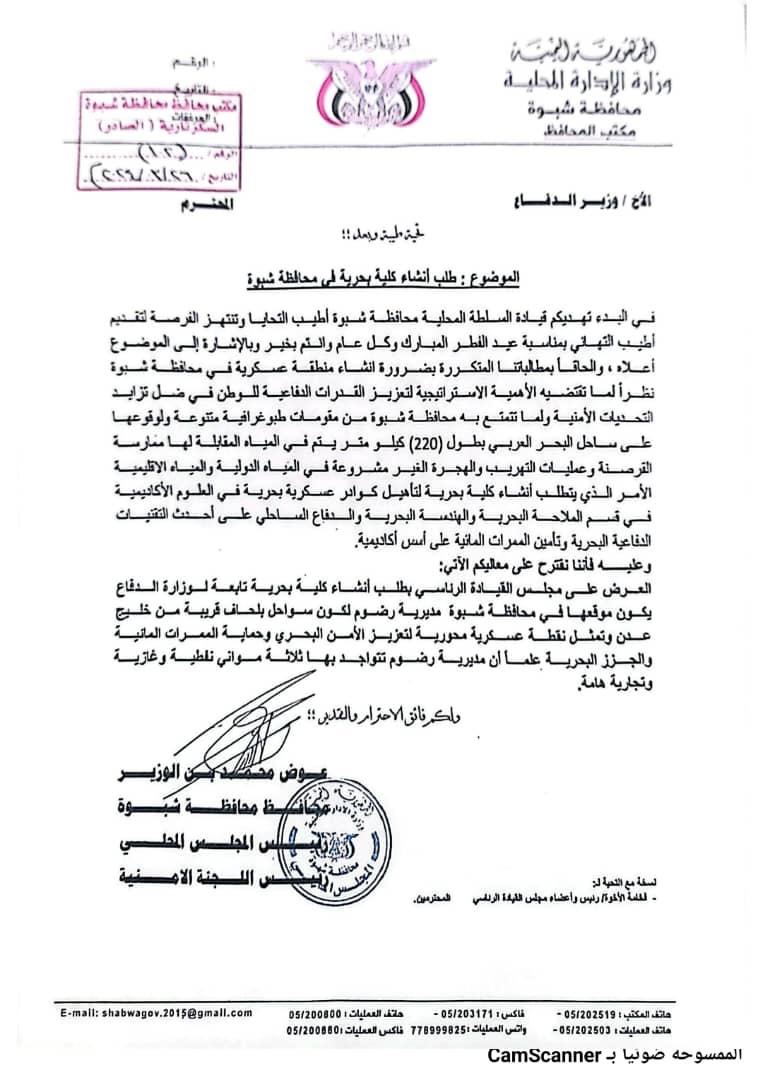 في مذكرة رسمية…المحافظ عوض بن الوزير يدعو لإنشاء كلية بحرية في شبوة لتعزيز قدرات الدفاع الوطني