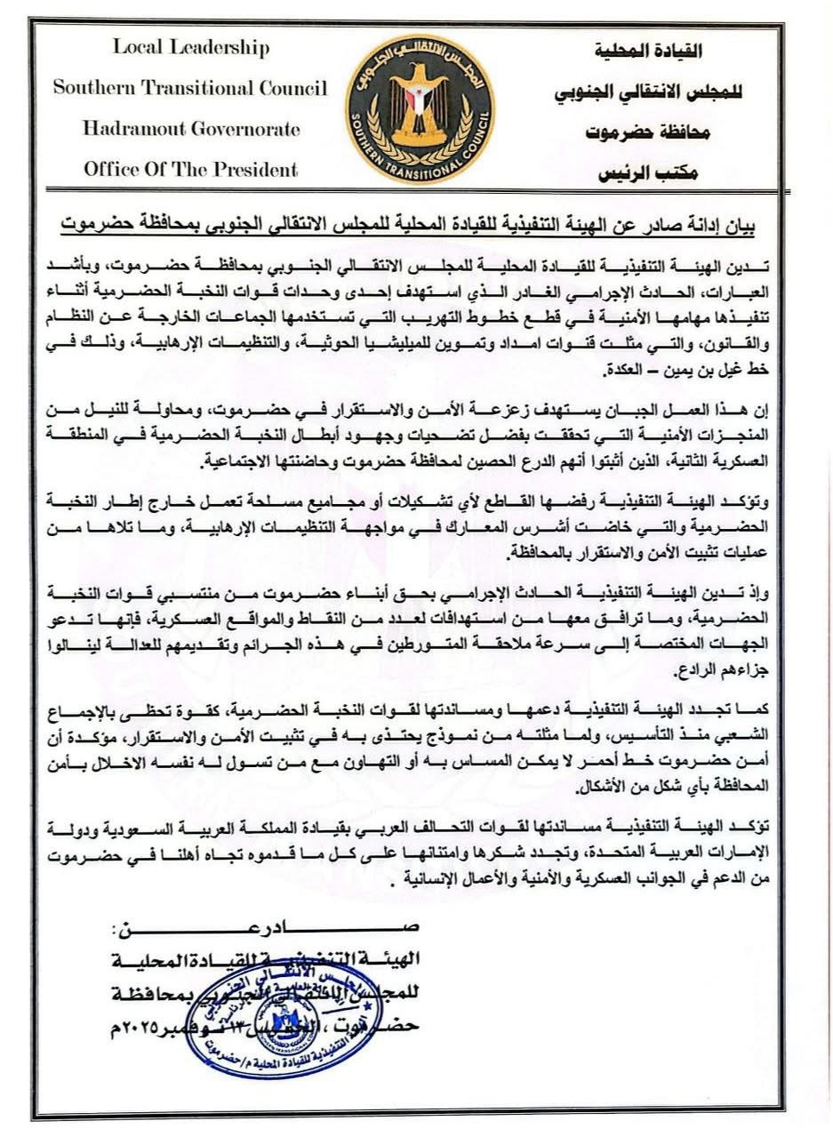بيان إدانة صادر عن الهيئة التنفيذية للقيادة المحلية للمجلس الانتقالي الجنوبي بمحافظة حضرموت