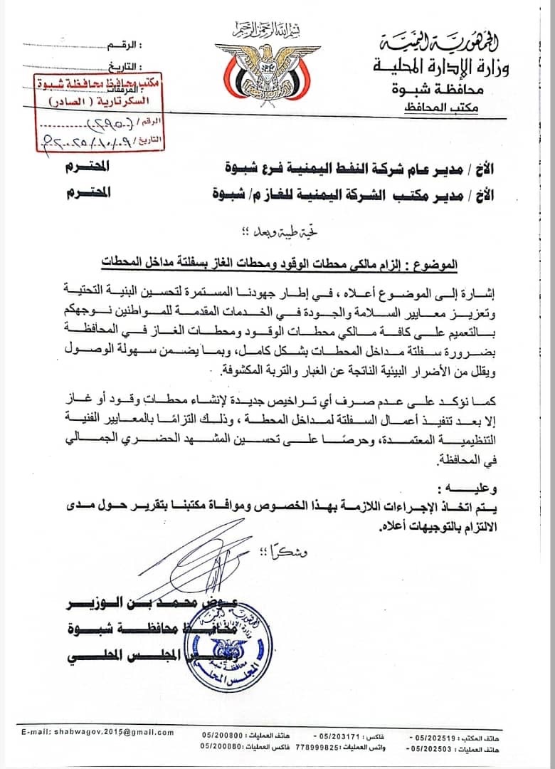 محافظ شبوة بن الوزير يوجه بإلزام مالكي محطات الوقود والغاز بسفلتة مداخل المحطات في شبوة