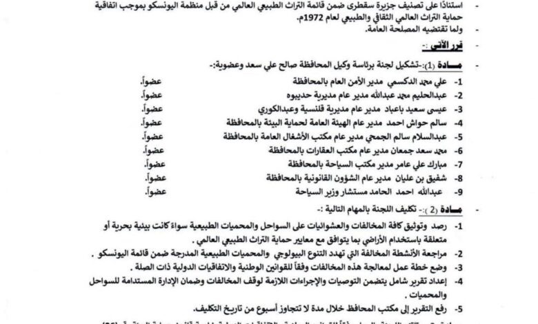محافظ سقطرى يصدر قرارين بتشكيل لجنتين لدراسة الموارد المالية وحماية السواحل والمحميات الطبيعية