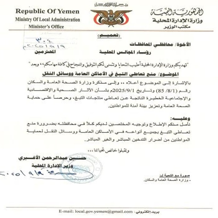 وزارة الإدارة المحلية تحظر تدخين وتعاطي التبغ في الأماكن العامة ووسائل النقل