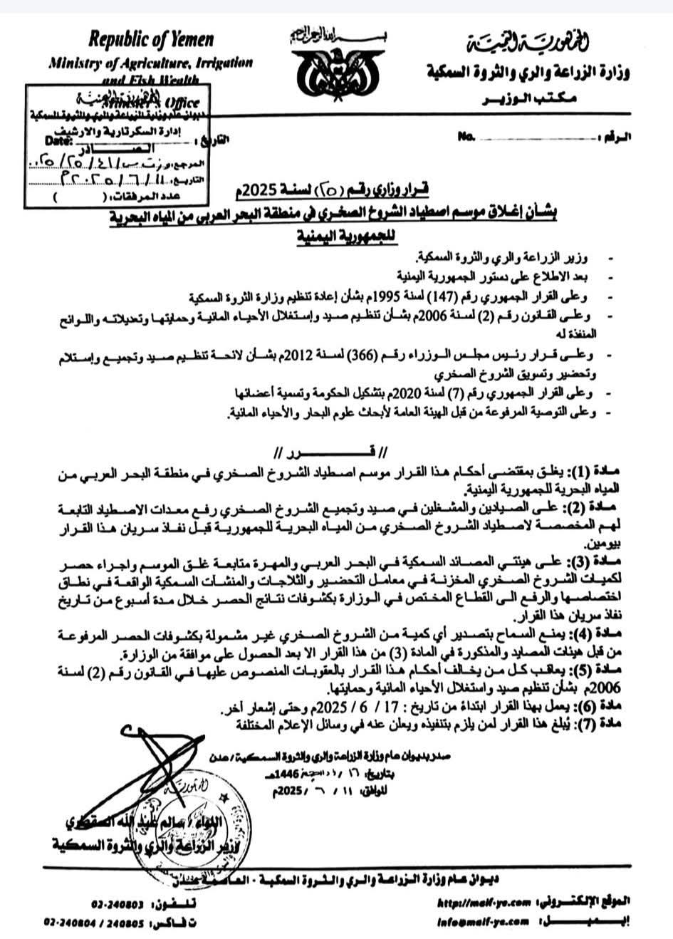 الوزير السقطري يصدر قرارا وزارياً بشأن إغلاق موسم اصطياد الشروخ الصخـري