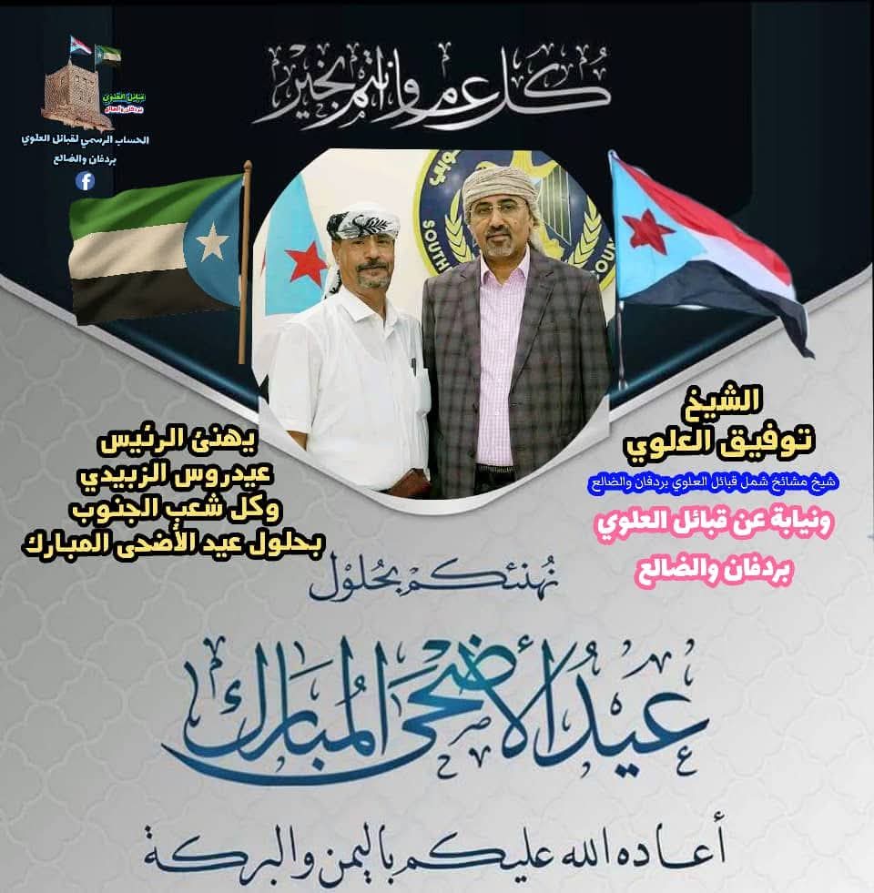 قبائل العلوي بردفان والضالع تهنئ الرئيس الزبيدي وشعب الجنوب بمناسبة عيد الأضحى المبارك.