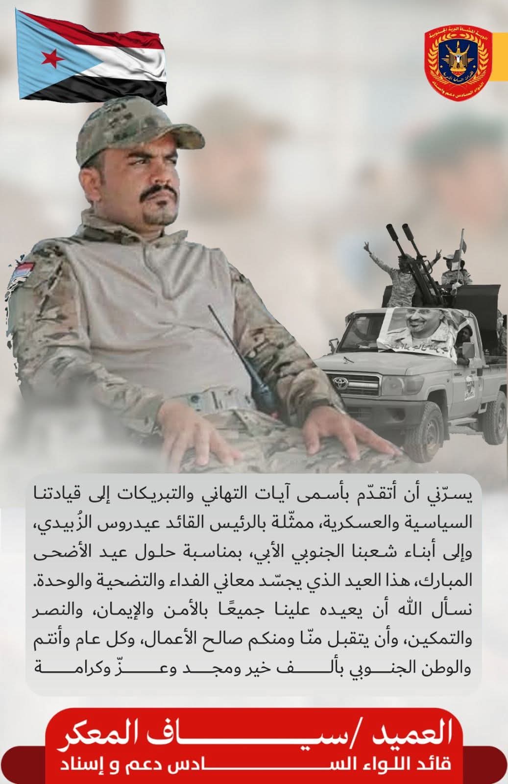 العميد سياف المعكر يهنئ شعب الجنوب والقيادة السياسية والعسكرية الجنوبية بمناسبة عيد الأضحى المبارك