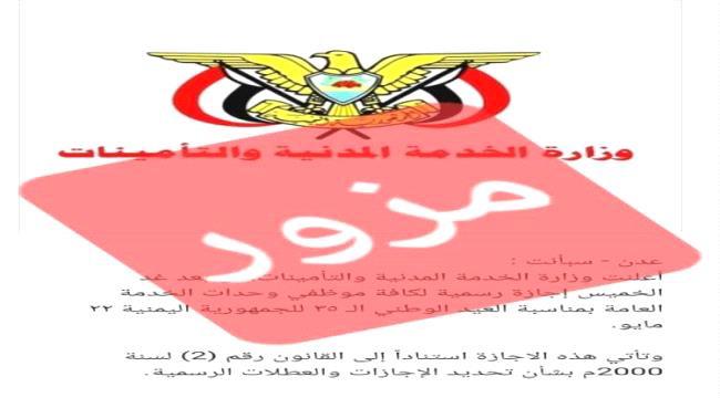 مصدر مسؤول في الخدمة المدنية : لا صحة لأي تعميم عن اجازة رسمية في 22 مايو