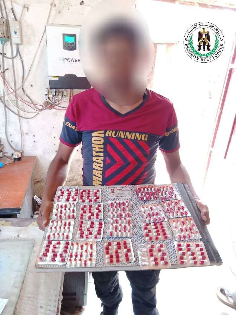 قوات الحزام الأمني بلحج تضبط مروجاً وبحوزته كمية من الحبوب المخدرة