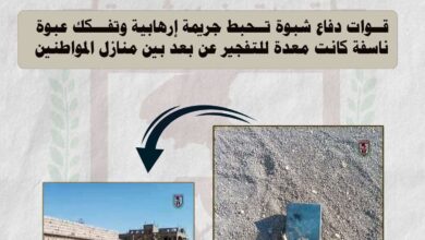 قوات دفاع شبوة تحبط جريمة إرهابية وتفكك عبوة ناسفة كانت معدة للتفجير عن بُعد بين منازل المواطنين
