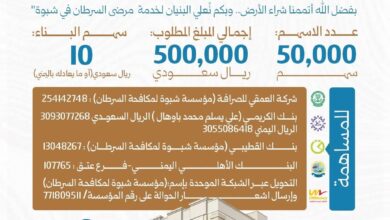 مؤسسة شبوة لمكافحة السرطان تطلق المرحلة الثانية من مشروع الوقف الخيري لدعم مرضى السرطان بالمحافظة.