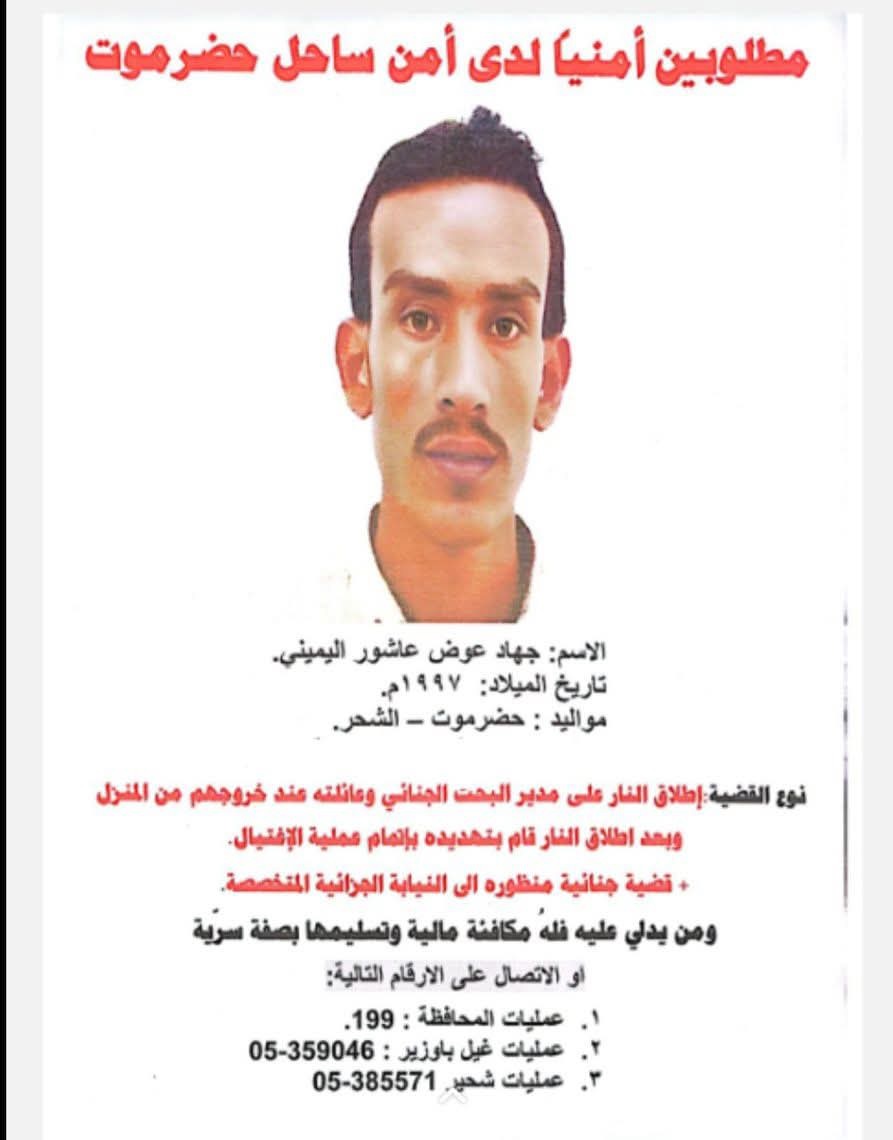 إدارة الأمن والشرطة بساحل حضرموت تصدر تعميم ضد مطلوب أمني وتؤكد مكافأة من يدلي بأي معلومة عنه
