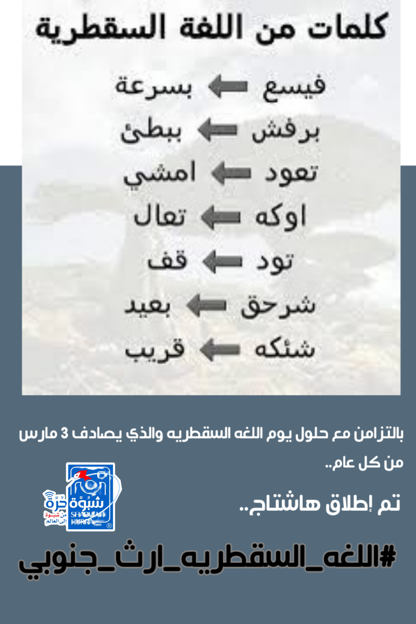 بالتزامن مع حلول يوم اللغة السقطرية.. سياسيون ونشطاء جنوبيون يطلقون هاشتاج #اللغه_السقطريه_ارث_جنوبي