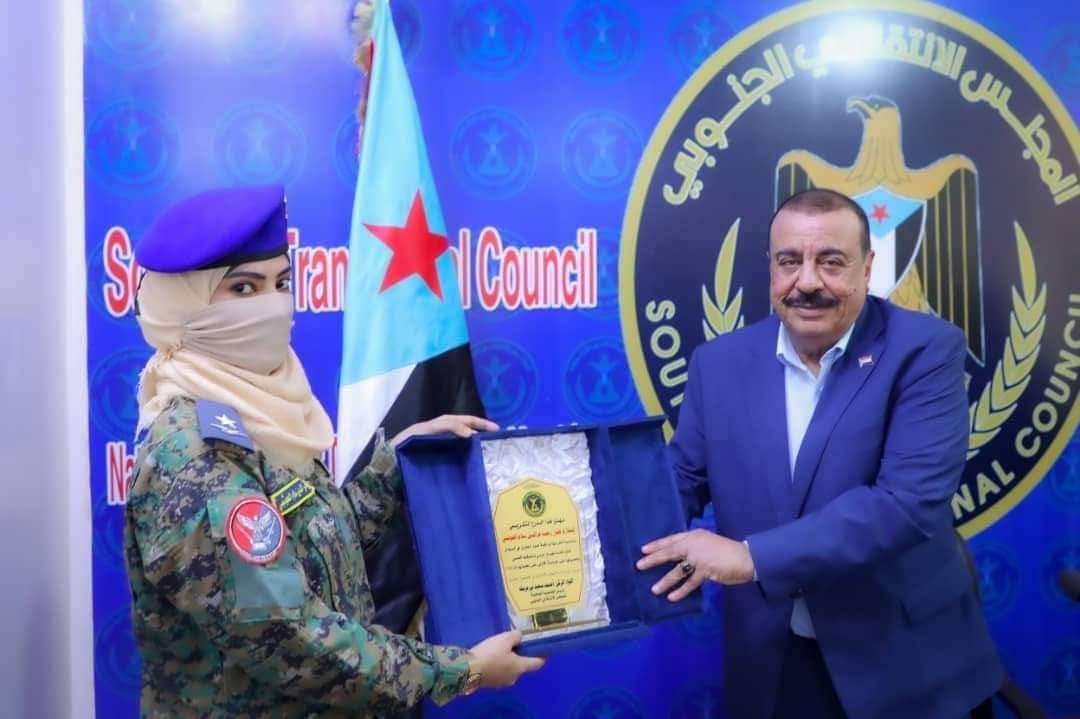 اللواء بن بريك يُكرم أول قائدة طيران حربي الملازم طيار رحمة عز الدين