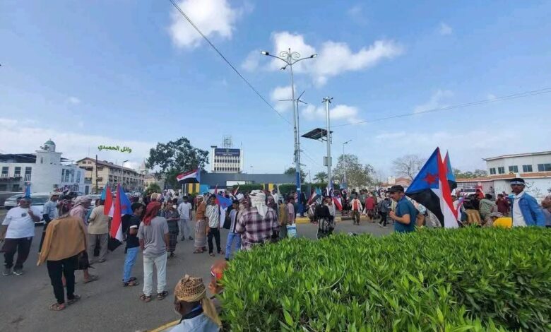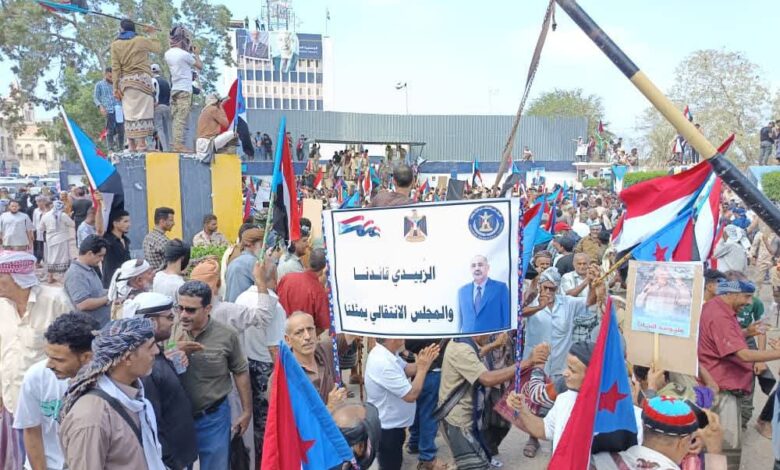 احتشاد آلاف المتظاهرين أمام مقر الجمعية الوطنية للانتقالي في التواهي رغم إغلاق سلطات الأمر الواقع للطرق المؤدية للمعلا