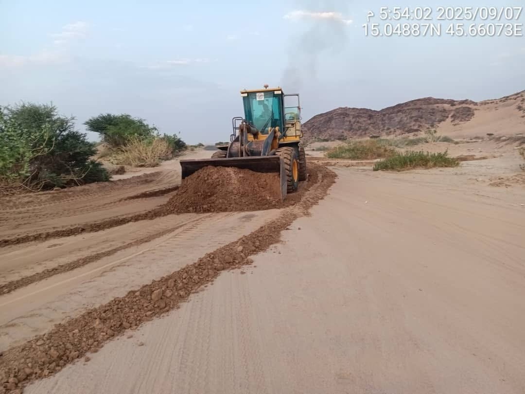 الفرق الفنية لمؤسسة الطرق والجسور بشبوة تواصل أعمالها الطارئة في طريق عتق – بيحان – حريب