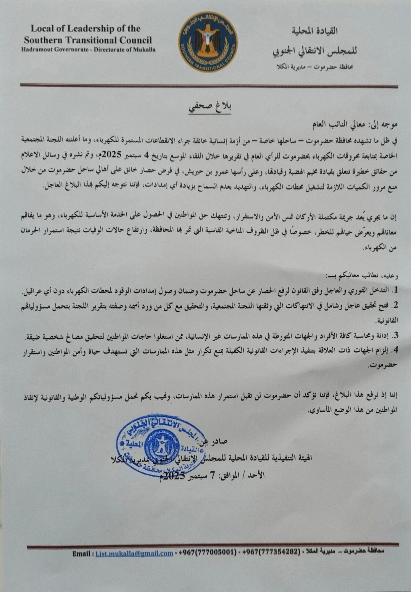 المجلس الإنتقالي الجنوبي في المكلا يصدر بلاغ صحفي موجه إلى معالي النائب العام
