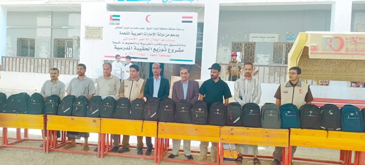 برعاية المحافظ بن الوزير .. الامين العام يدشن مشروع الحقيبة المدرسية بدعم الهلال الأحمر الإماراتي