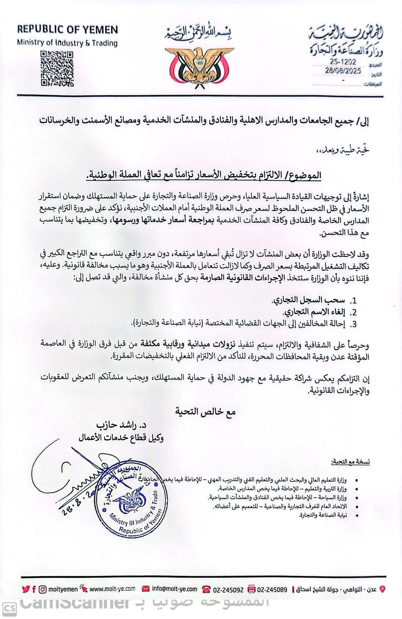 وزارة الصناعة والتجارة تشدد إجراءاتها القانونية الصارمة على المدارس الأهلية والجامعات والمنشآت الخدمية المخالفة