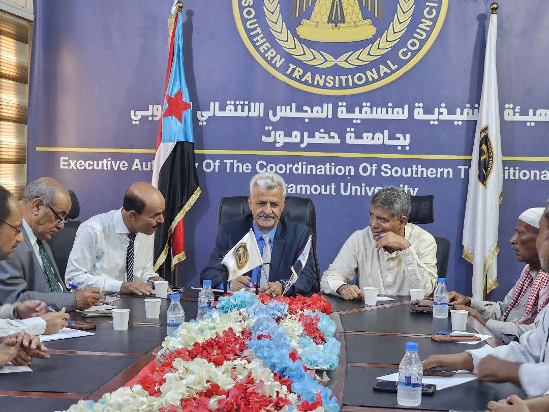 فريق التوجيه والرقابة الرئاسي يعقد لقاءً مع الهيئة التنفيذية لمنسقية الانتقالي بجامعة حضرموت