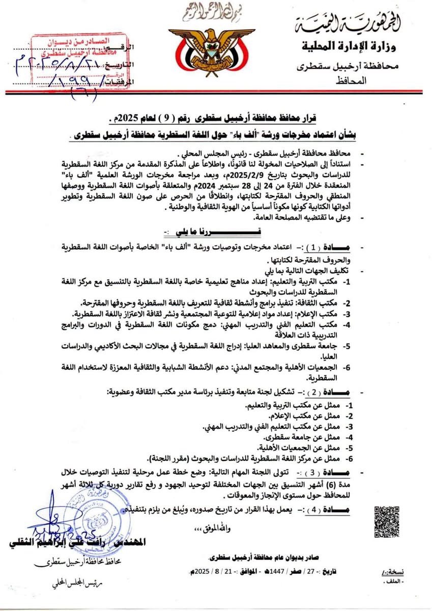 محافظ سقطرى يعتمد أبجدية “ألف باء” للغة السقطرية في خطوة تاريخية