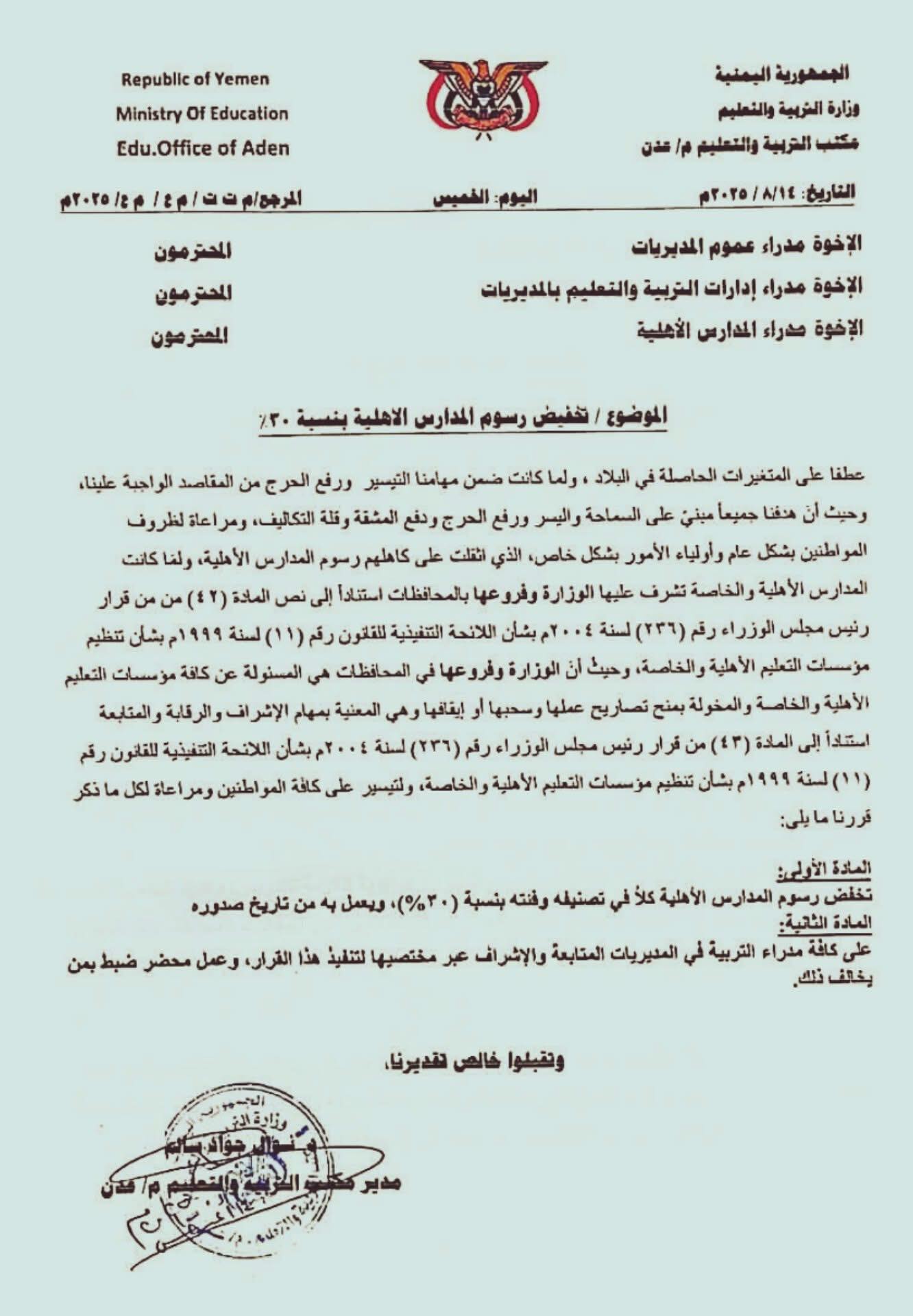 مكتب التربية بالعاصمة عدن يقر خفض رسوم المدارس الأهلية بنسبة 30% (وثيقة)