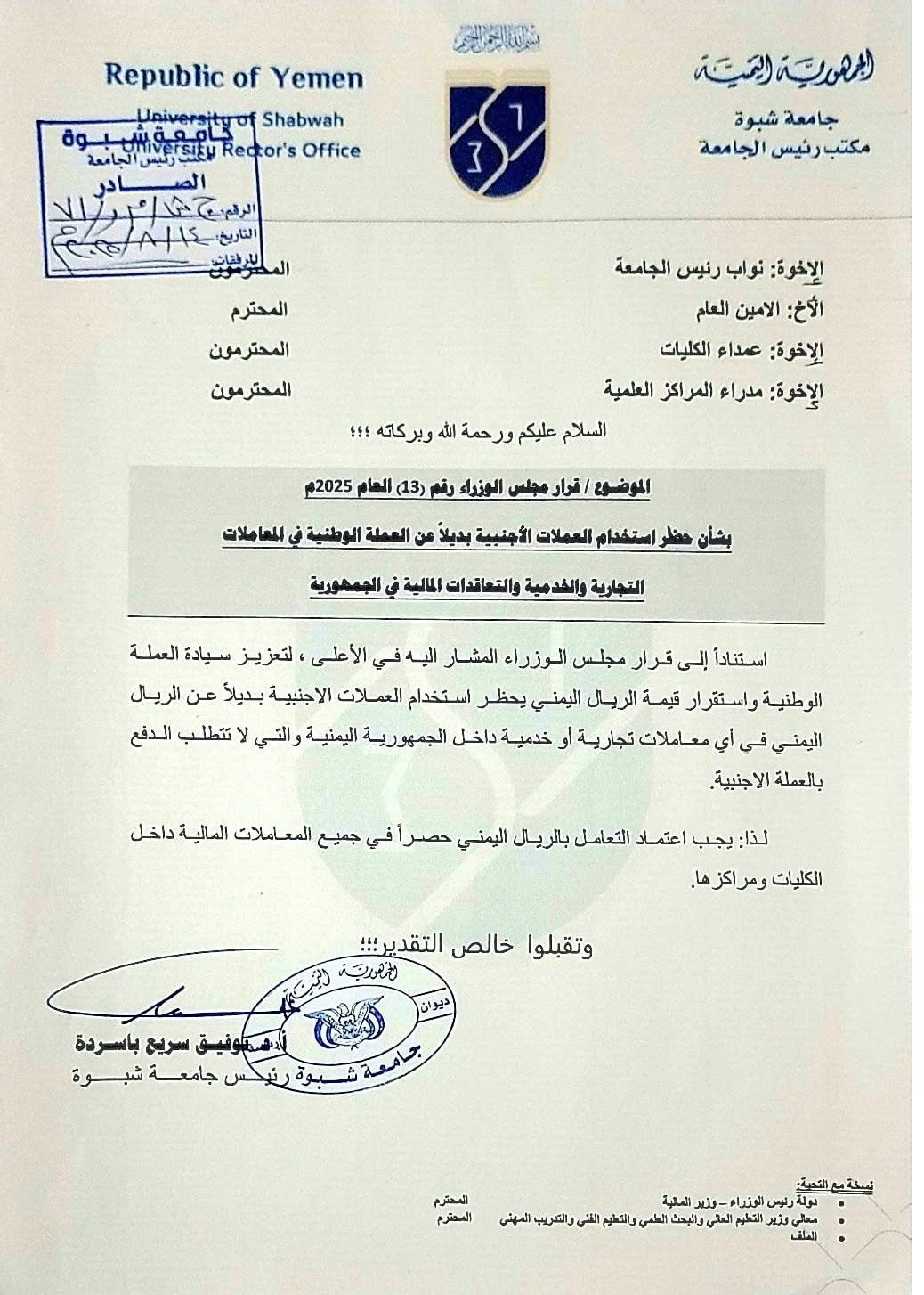 جامعة شبوة تقر التعامل الحصري بالعملة الوطنية تنفيذًا لقرار مجلس الوزراء