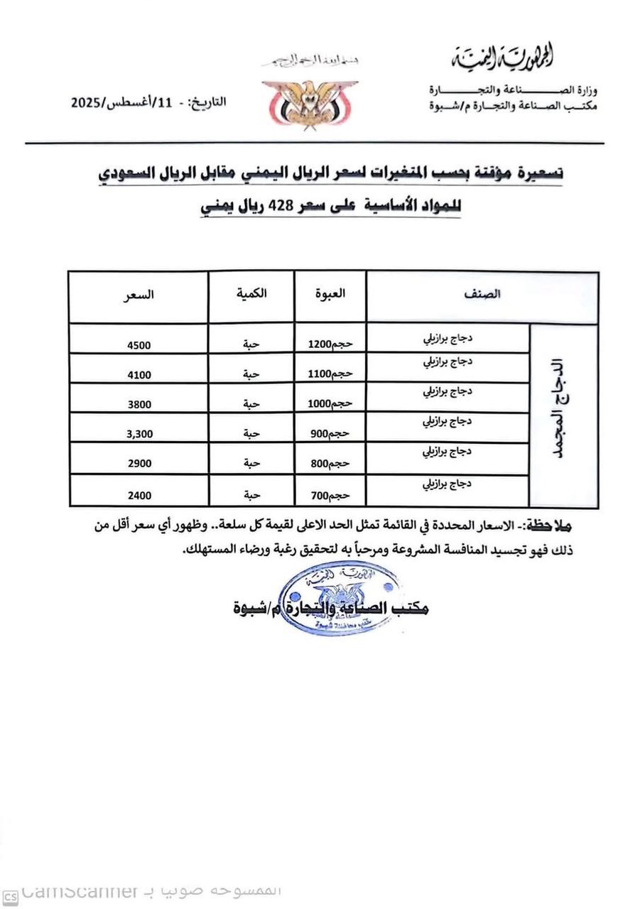 شبوة:مكتب الصناعة والتجارة يعلن القائمة المحدثة لأسعار المواد الأساسية