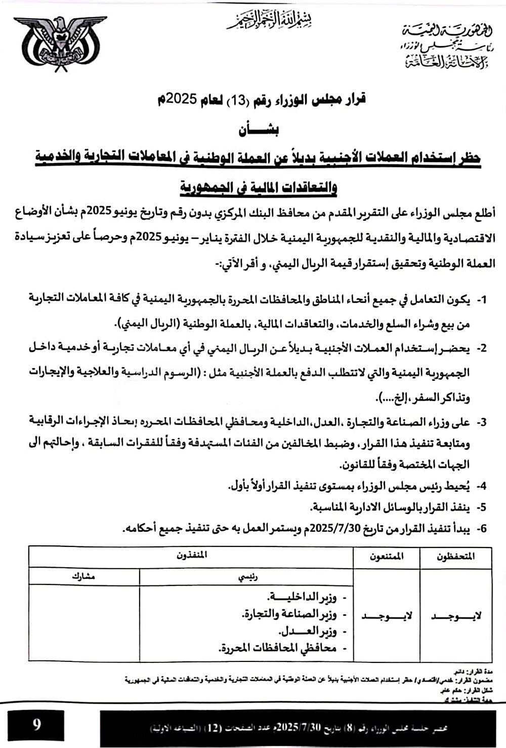 قرار مجلس الوزراء رقم (13) لعام 2025م،بشأن حظر استخدام العملات الأجنبية بديلاً عن العملة الوطنية في المعاملات التجارية والخدمية والتعاقدات المالية في أنحاء البلاد.