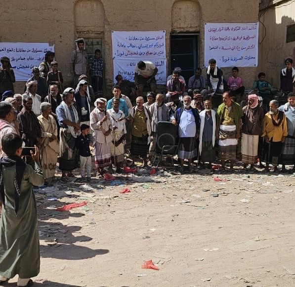 أهالي يشبم ينظمون وقفة تضامنية للمطالبة بإعادة فتح محلات الصرافة المغلقة