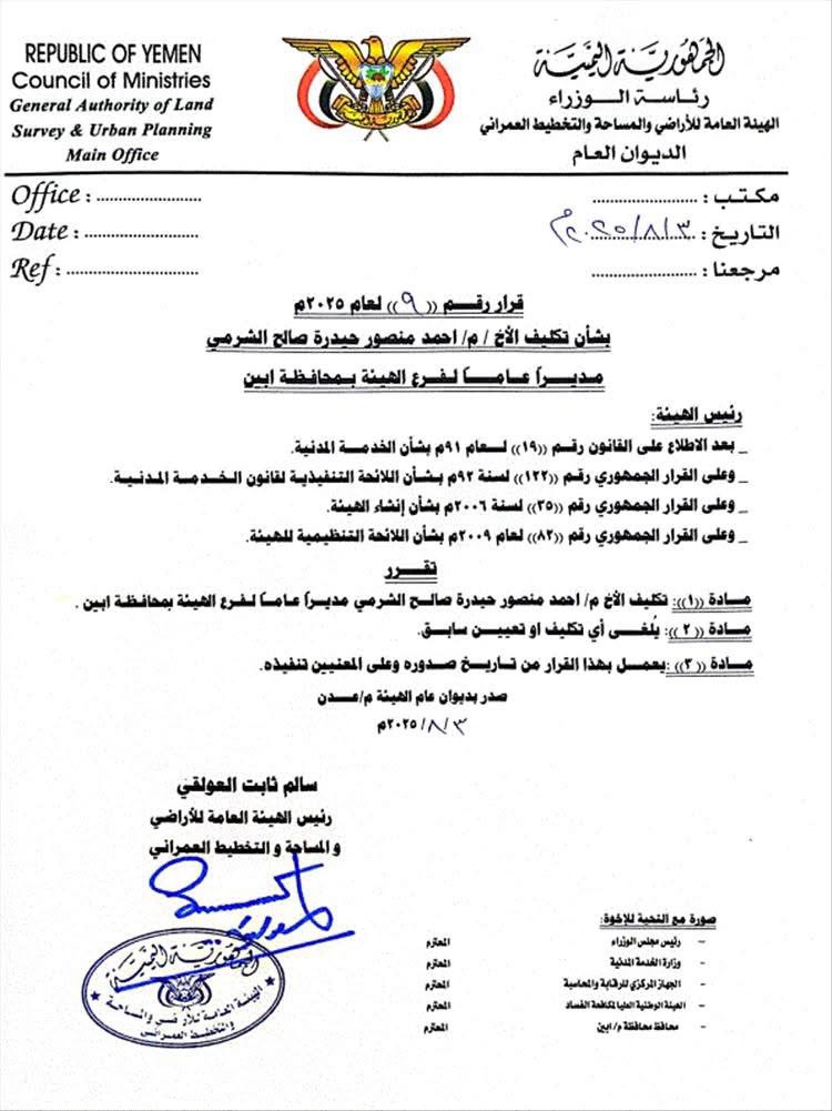 العولقي يصدر قرار تكليف المهندس أحمد الشرمي مديرًا عامًا لفرع الهيئة العامة للأراضي بأبين