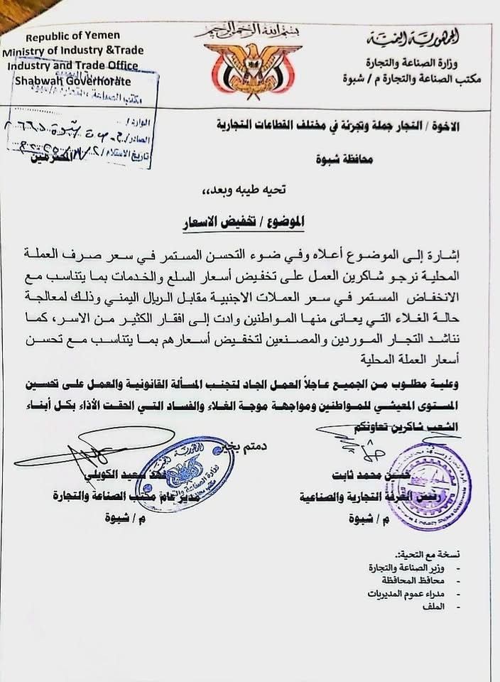 مكتب الصناعة والغرفة التجارية بشبوة يوجهان التجار بالالتزام بالتسعيرة الجديدة.