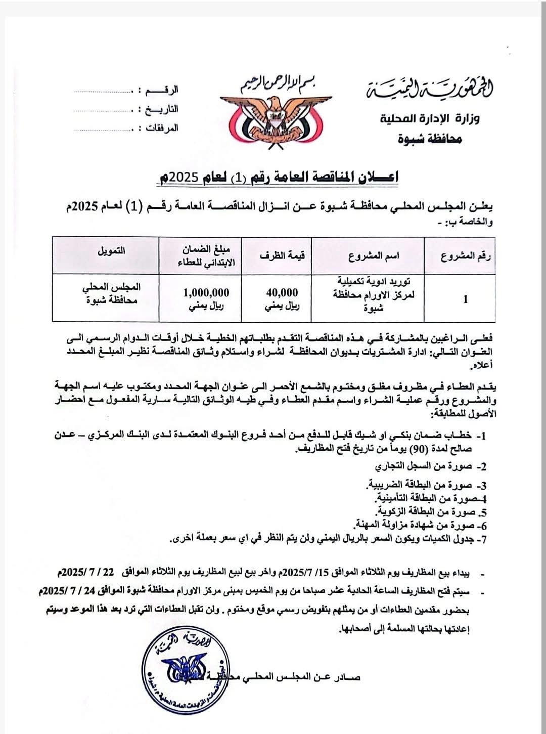 شبوة: السلطة المحلية تعلن عن مناقصة لتوريد أدوية لمركز علاج الأورام بالمحافظة